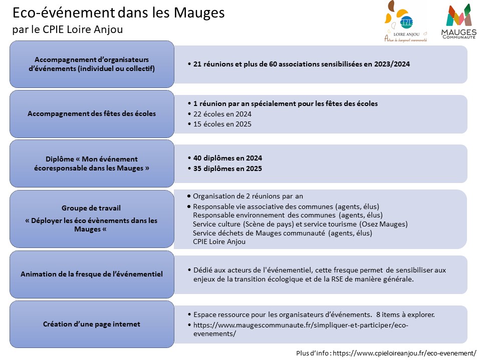 Le CPIE Loire Anjou s’inscrit dans une dynamique régionale d’accompagnement d’événements écoresponsables animée par le REEVE (Réseau Eco-Evénements en Pays de la Loire) et est son relais local pour le territoire de Mauges Communauté.